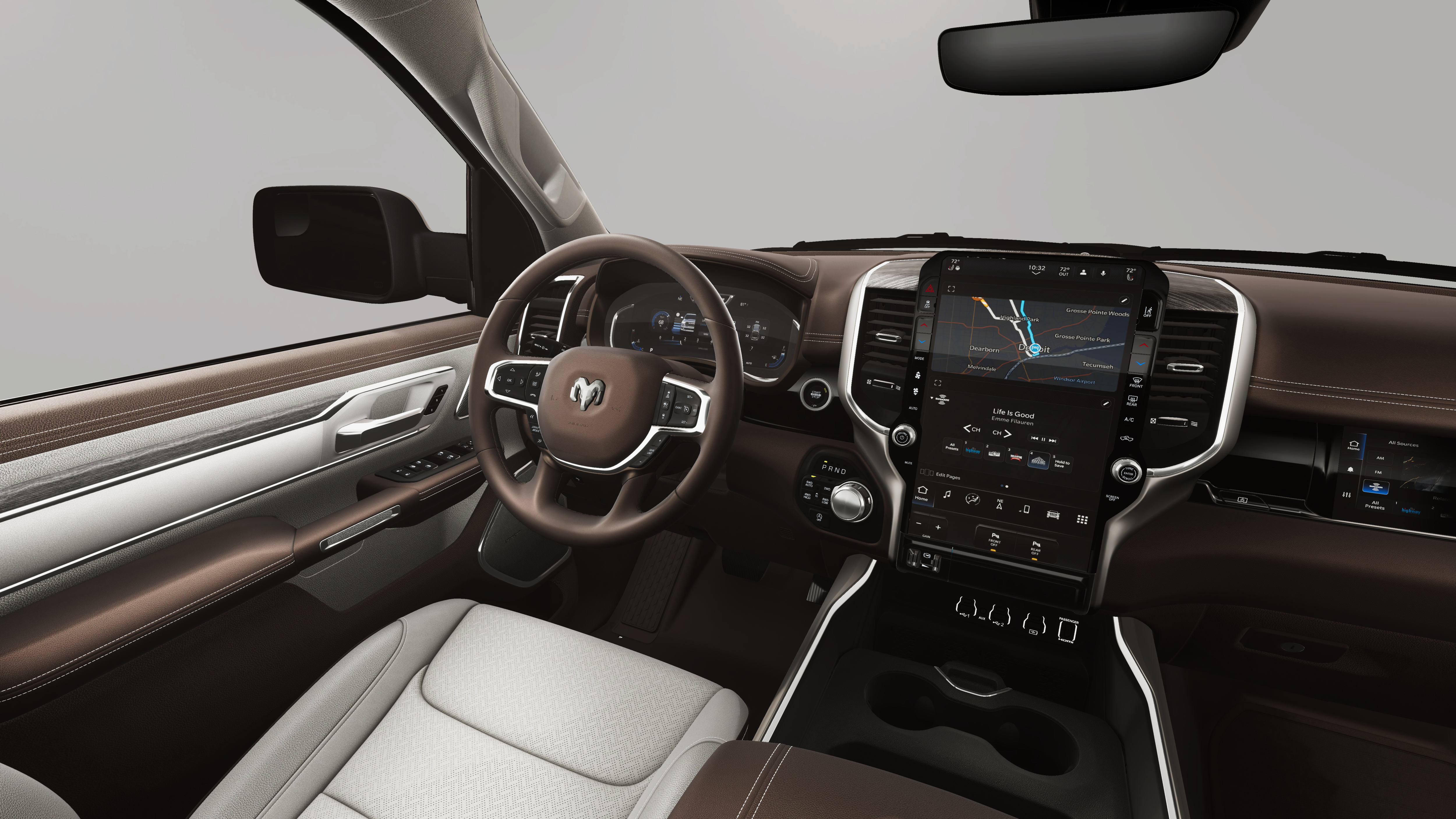 This Ram 1500 is equipped with the following features: 10 Speakers, 3.55 Rear Axle Ratio, 4-Wheel Disc Brakes, 4G LTE Wi-Fi Hot Spot, ABS brakes, Active Noise Control System, Adjustable pedals, Air Conditioning, Alloy wheels, AM/FM radio: SiriusXM with 360L, Apple CarPlay/Android Auto, Audio memory, Auto High-beam Headlights, Auto Power-Folding Mirrors, Auto-dimming door mirrors, Auto-Dimming Exterior Driver Mirror, Auto-dimming Rear-View mirror, Automatic temperature control, Brake assist, Bumpers: chrome, Chrome Exterior Mirrors, Compass, Connected Travel and Traffic Services, Connectivity - US/Canada, Convex Wide-Angle Exterior Mirror Insert, Delay-off headlights, Driver door bin, Driver vanity mirror, Dual front impact airbags, Dual front side impact airbags, Electronic Stability Control, Exterior Mirrors Courtesy Lamps, Exterior Mirrors with Heating Element, Exterior Mirrors with Memory, Exterior Mirrors with Supplemental Signals, Front anti-roll bar, Front Bucket Seats, Front Center Armrest w/Storage, Front dual zone A/C, Front fog lights, Front reading lights, Front wheel independent suspension, Fully automatic headlights, Garage door transmitter, GPS Navigation, Heated door mirrors, Heated front seats, Heated rear seats, Heated steering wheel, Illuminated entry, Integrated Center Stack Radio, Integrated Voice Command with Bluetooth®, Leather steering wheel, Leather Trimmed Bucket Seats, Low tire pressure warning, Memory seat, Navigation System, Occupant sensing airbag, Off-Road Information Pages, Outside temperature display, Overhead airbag, Overhead console, Panic alarm, ParkView Rear Back-Up Camera, Passenger door bin, Passenger vanity mirror, Pedal memory, Power door mirrors, Power driver seat, Power passenger seat, Power steering, Power windows, Radio data system, Radio: Uconnect 5 Navigation with 12.0 Display, RAM Grille Badge - Chrome, Rear anti-roll bar, Rear reading lights, Rear seat center armrest, Rear step bumper, Remote keyless entry, Security system, SiriusXM Radio Service, SiriusXM with 360L, Speed control, Split folding rear seat, Steering wheel mounted audio controls, Tachometer, Telescoping steering wheel, Tilt steering wheel, Traction control, Trip computer, Turn signal indicator mirrors, USB Host Flip, Variably intermittent wipers, Ventilated front seats, Voltmeter, and Wheels: 20 x 9 Premium Paint/Polish. Recent Arrival!