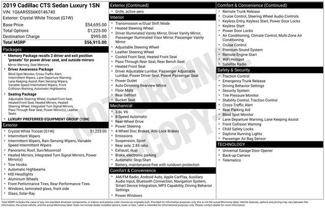 Crystal White Tricoat 2019 Cadillac CTS 3.6L Luxury RWD 8-Speed Automatic 3.6L V6 SIDI DOHC VVT