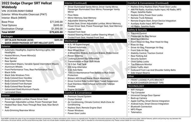 White Knuckle Clearcoat 2022 Dodge Charger SRT Hellcat Widebody RWD 8-Speed Automatic 6.2L 8-Cylinder SMPI Supercharged OHV Black Leather.