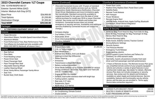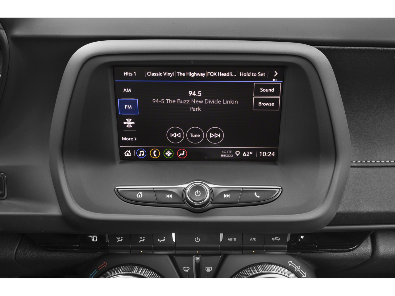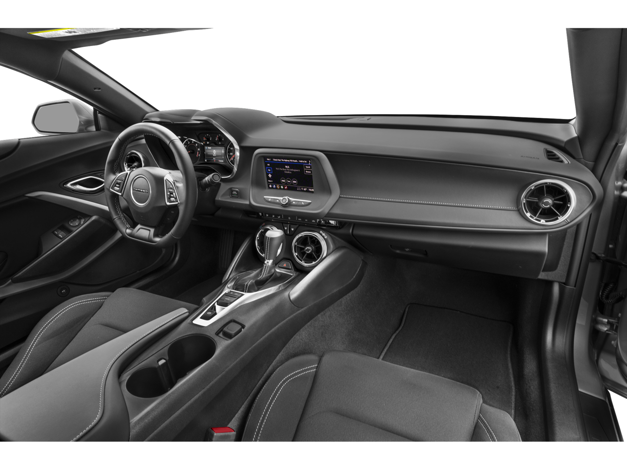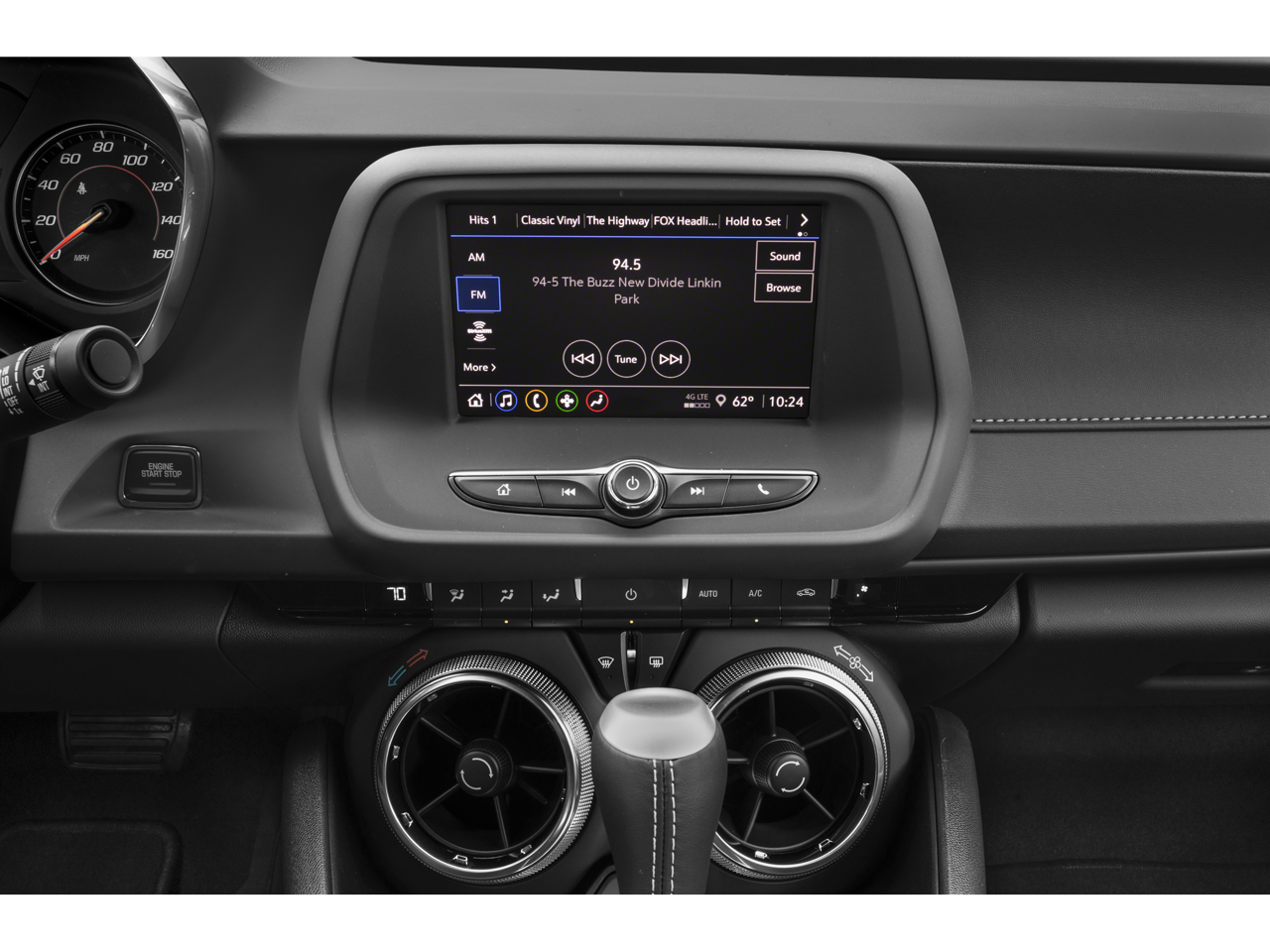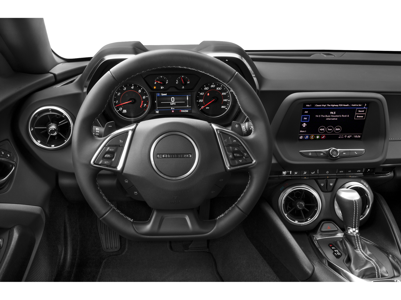This Chevrolet Camaro is equipped with the following features: 4-Wheel Disc Brakes, 6 Speakers, 6-Speaker Audio System Feature, 8-Way Power Driver Seat Adjuster, ABS brakes, Air Conditioning, Alloy wheels, Apple CarPlay/Android Auto, Automatic temperature control, Bluetooth® For Phone, Brake assist, Bumpers: body-color, Cloth Seat Trim, Compass, Delay-off headlights, Deleted 3 Years of Remote Access, Driver door bin, Driver vanity mirror, Dual front impact airbags, Dual front side impact airbags, Electronic Stability Control, Exterior Parking Camera Rear, Four wheel independent suspension, Front anti-roll bar, Front Bucket Seats, Front Center Armrest, Front License Plate Bracket, Front reading lights, Front Sport Bucket Seats, Fully automatic headlights, Illuminated entry, Knee airbag, Leather Shift Knob, Low tire pressure warning, Occupant sensing airbag, Overhead airbag, Paddle-Shift Manual Controls, Panic alarm, Passenger door bin, Passenger vanity mirror, Power door mirrors, Power driver seat, Power passenger seat, Power steering, Power windows, Premium audio system: Chevrolet Infotainment System, Radio data system, Radio: Chevrolet Infotainment 3 System, Rear anti-roll bar, Rear window defroster, Remote keyless entry, Remote Vehicle Starter System, Security system, Speed control, Speed-sensing steering, Steering wheel mounted audio controls, Tachometer, Telescoping steering wheel, Tilt steering wheel, Tire Inflation Kit, Traction control, Trip computer, Variably intermittent wipers, and Voltmeter. 22/30 City/Highway MPG