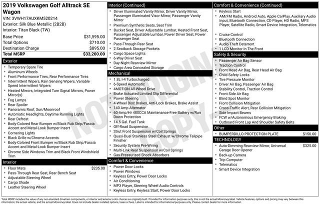 This Volkswagen Golf Alltrack is equipped with the following features: 4-Wheel Disc Brakes, 6 Speakers, ABS brakes, Air Conditioning, Alloy wheels, Alltrack Rubber Mats Kit, AM/FM radio: SiriusXM, Anti-whiplash front head restraints, Brake assist, Bumperdillo Protection Plate, Bumpers: body-color, CD player, Compass, Delay-off headlights, Driver door bin, Driver vanity mirror, Dual front impact airbags, Dual front side impact airbags, Electronic Stability Control, Emergency communication system: VW Car-Net services (capabilities require enrollment or subscription), Exterior Parking Camera Rear, Forward collision: FCW w/Autonomous Emergency Braking mitigation, Four wheel independent suspension, Frameless Self-Dimming Rearview Mirror, Front anti-roll bar, Front Bucket Seats, Front Center Armrest, Front fog lights, Front reading lights, Fully automatic headlights, Heated door mirrors, Heated Front Comfort Seats, Heated front seats, Heavy Duty Trunk Liner w/VW CarGo Blocks, Illuminated entry, Leather Shift Knob, Low tire pressure warning, Occupant sensing airbag, Outside temperature display, Overhead airbag, Overhead console, Panic alarm, Passenger door bin, Passenger vanity mirror, Perforated V-Tex Leatherette Seating Surfaces, Power door mirrors, Power driver seat, Power moonroof, Power passenger seat, Power steering, Power windows, Radio data system, Radio: Composition Media w/8 Touchscreen, Rain sensing wipers, Rear anti-roll bar, Rear reading lights, Rear seat center armrest, Rear window defroster, Rear window wiper, Remote keyless entry, Roof rack: rails only, Speed control, Speed-sensing steering, Speed-Sensitive Wipers, Split folding rear seat, Spoiler, Steering wheel mounted audio controls, Tachometer, Telescoping steering wheel, Tilt steering wheel, Traction control, Trip computer, Turn signal indicator mirrors, Variably intermittent wipers, Wheels: 17 10-Spoke Silver Alloy, and Wheels: 18 Y-Spoke Silver Alloy. Recent Arrival! 22/30 City/Highway MPG