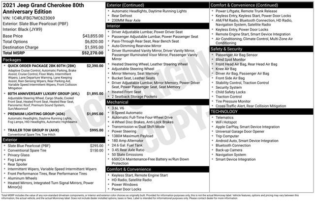 Pacific Blue Clearcoat 2021 Jeep Grand Cherokee 80th Anniversary Edition 4WD 8-Speed Automatic 3.6L V6 24V VVT 4WD.