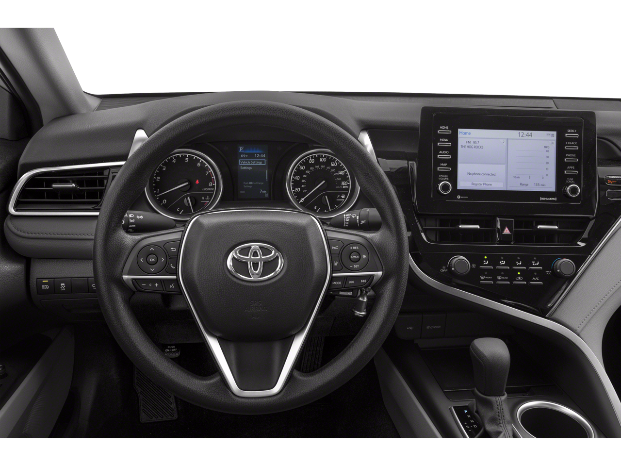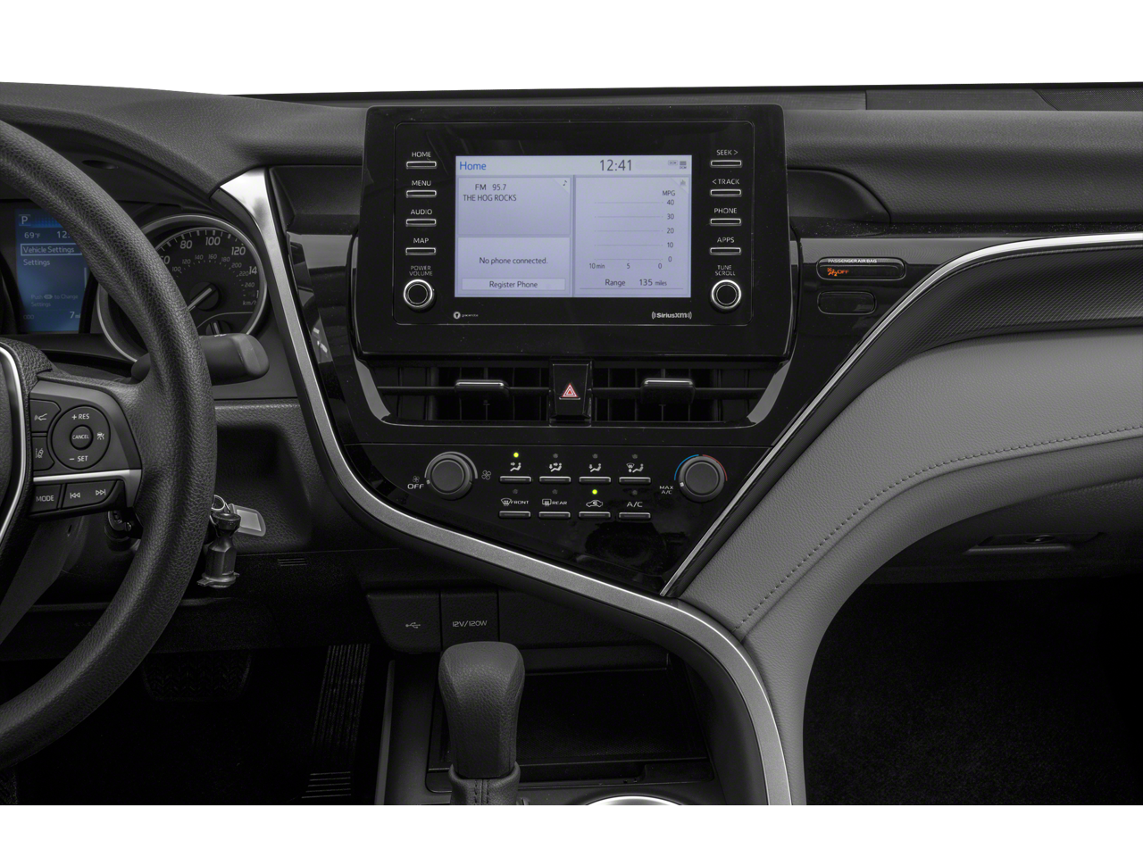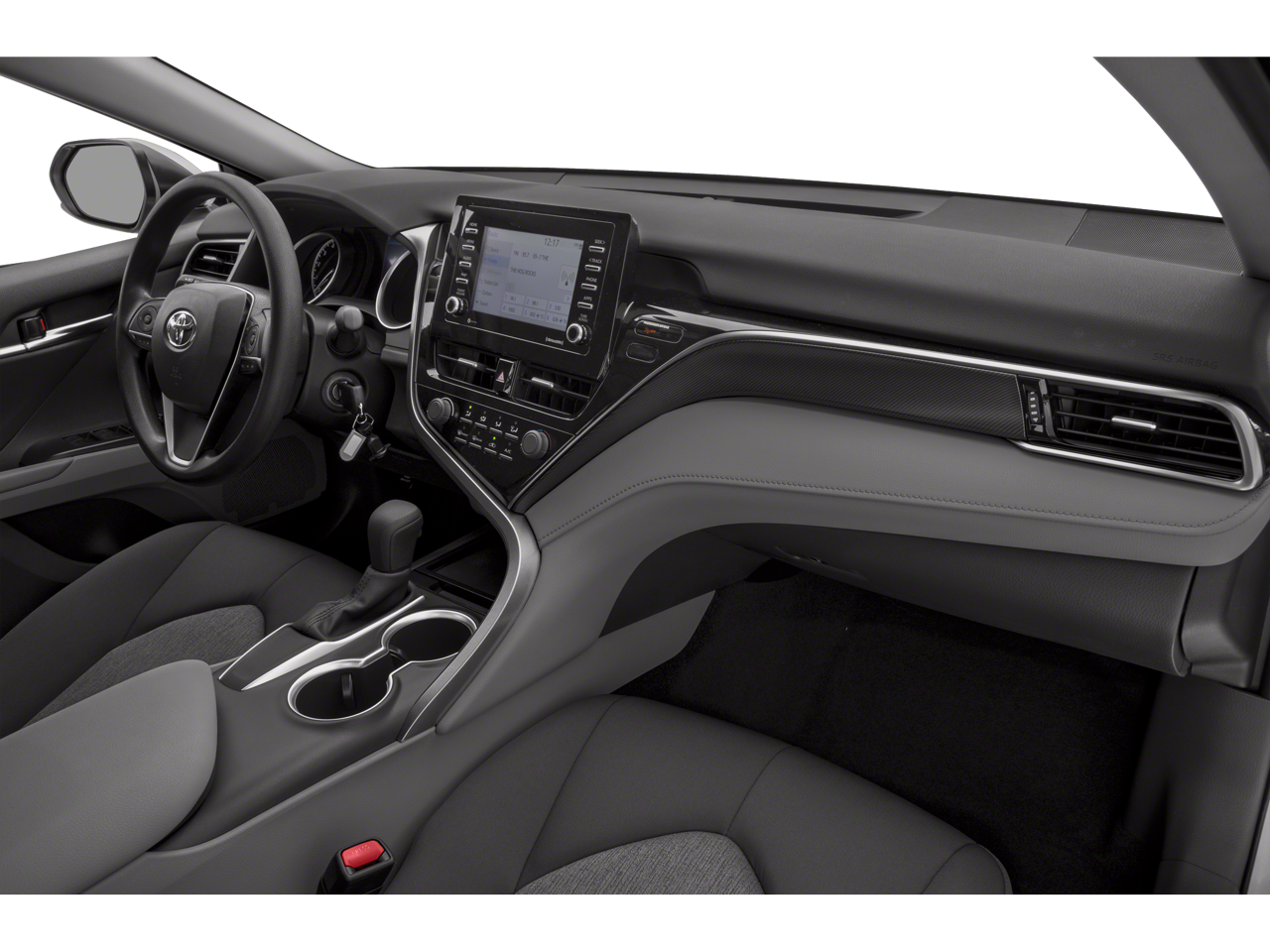 This Toyota Camry is equipped with the following features: Cloth, 4-Wheel Disc Brakes, 6 Speakers, 7.5J x 17 Alloy Wheels, ABS brakes, Air Conditioning, Alloy wheels, AM/FM radio: SiriusXM, Apple CarPlay/Android Auto, Auto High-beam Headlights, Automatic temperature control, Brake assist, Bumpers: body-color, Delay-off headlights, Driver door bin, Driver vanity mirror, Dual front impact airbags, Dual front side impact airbags, Electronic Stability Control, Emergency communication system: Safety Connect with 1-year trial, Exterior Parking Camera Rear, Fabric Seat Trim, Four wheel independent suspension, Front anti-roll bar, Front Bucket Seats, Front Center Armrest, Front dual zone A/C, Front reading lights, Fully automatic headlights, Illuminated entry, Knee airbag, Low tire pressure warning, Occupant sensing airbag, Outside temperature display, Overhead airbag, Overhead console, Panic alarm, Passenger door bin, Passenger vanity mirror, Power door mirrors, Power driver seat, Power steering, Power windows, Radio data system, Radio: AM/FM Audio System, Rear anti-roll bar, Rear seat center armrest, Rear side impact airbag, Rear window defroster, Remote keyless entry, Security system, Speed control, Speed-sensing steering, Split folding rear seat, Steering wheel mounted audio controls, Tachometer, Telescoping steering wheel, Tilt steering wheel, Traction control, Trip computer, and Variably intermittent wipers. Recent Arrival! Odometer is 5633 miles below market average! 28/39 City/Highway MPG