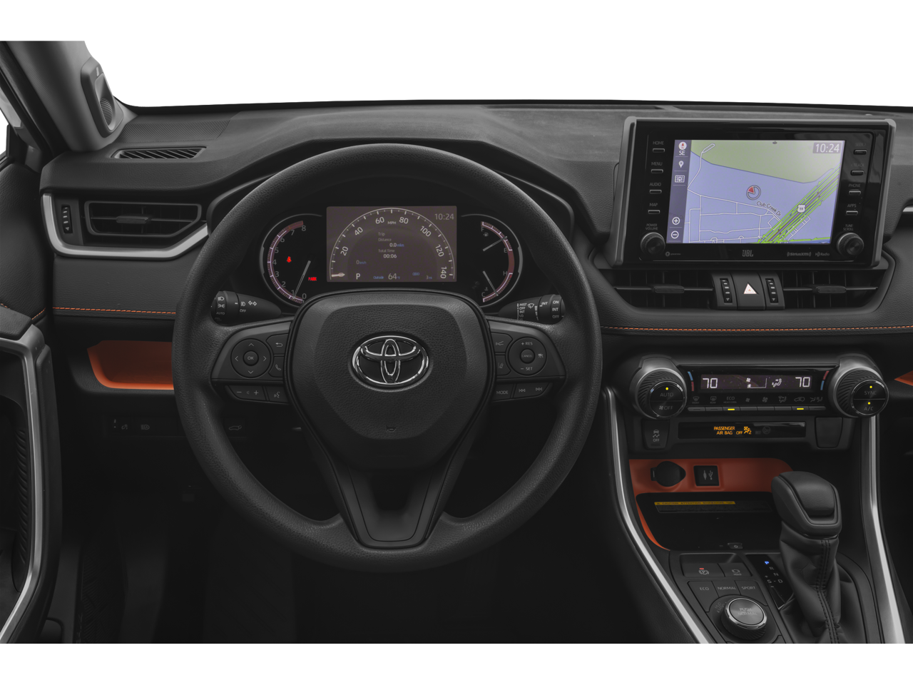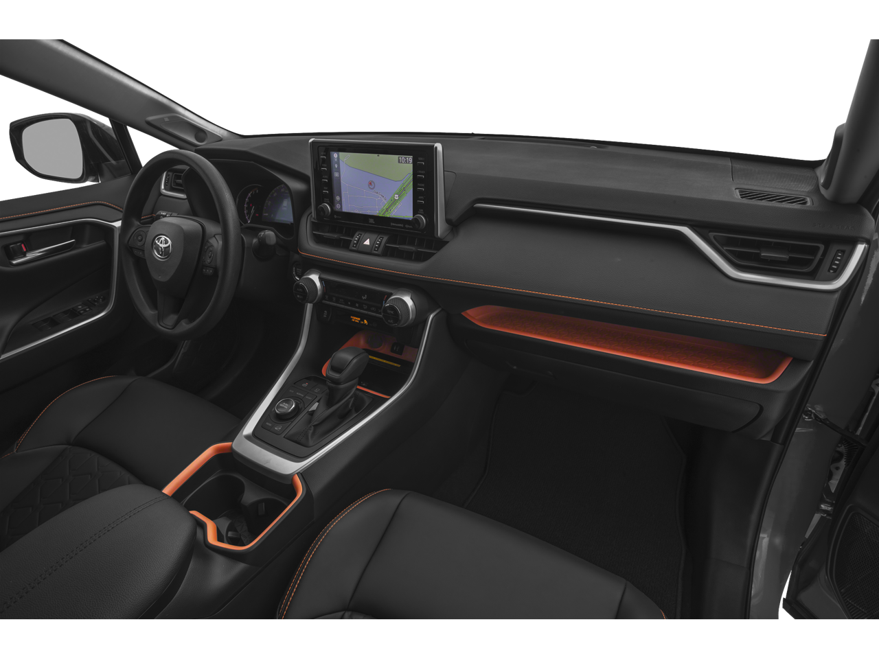 This Toyota RAV4 is equipped with the following features: AWD, 19 Split 5-Spoke Alloy Wheels, 4-Wheel Disc Brakes, 6 Speakers, ABS brakes, Air Conditioning, Alloy wheels, AM/FM radio: SiriusXM, Apple CarPlay/Android Auto, Auto High-beam Headlights, Automatic temperature control, Axle Ratio: 3.177, Brake assist, Bumpers: body-color, Delay-off headlights, Driver door bin, Driver vanity mirror, Dual front impact airbags, Dual front side impact airbags, Electronic Stability Control, Emergency communication system: Safety Connect with 1-year trial, Exterior Parking Camera Rear, Four wheel independent suspension, Front anti-roll bar, Front Bucket Seats, Front Center Armrest, Front dual zone A/C, Front fog lights, Front reading lights, Fully automatic headlights, Heated door mirrors, Illuminated entry, Knee airbag, Leather Shift Knob, Low tire pressure warning, Occupant sensing airbag, Outside temperature display, Overhead airbag, Overhead console, Panic alarm, Passenger door bin, Passenger vanity mirror, Power door mirrors, Power driver seat, Power steering, Power windows, Radio data system, Radio: Audio Plus, Rear anti-roll bar, Rear seat center armrest, Rear window defroster, Rear window wiper, Remote keyless entry, Roof rack: rails only, Security system, SofTex Seat Trim, Speed control, Speed-sensing steering, Split folding rear seat, Spoiler, Steering wheel mounted audio controls, Tachometer, Telescoping steering wheel, Tilt steering wheel, Traction control, Trip computer, Turn signal indicator mirrors, and Variably intermittent wipers. 25/33 City/Highway MPG