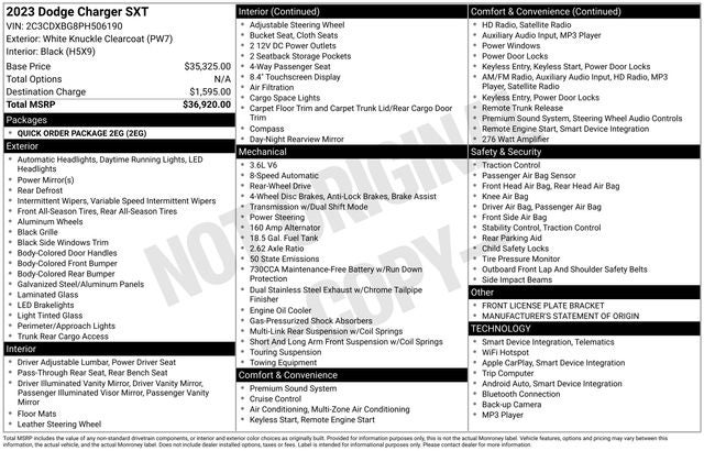 White Knuckle Clearcoat 2023 Dodge Charger SXT RWD 8-Speed Automatic 3.6L V6 24V VVT Black Cloth.