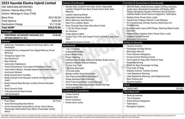 This Hyundai Elantra Hybrid is equipped with the following features: Option Group 01, Preferred Accessory Package (Cargo Side Bins, First Aid Kit, and Trunk/Cargo Hook), I4, 17 x 7.0J Alloy Wheels, 4-Wheel Disc Brakes, 8 Speakers, ABS brakes, Air Conditioning, Alloy wheels, AM/FM radio: SiriusXM, Apple CarPlay & Android Auto, Auto High-beam Headlights, Auto-dimming Rear-View mirror, Automatic temperature control, Brake assist, Bumpers: body-color, Cargo Net, Carpeted Floor Mats, Delay-off headlights, Driver door bin, Driver vanity mirror, Dual front impact airbags, Dual front side impact airbags, Electronic Stability Control, Emergency communication system: Blue Link Connected Car Service (3-year complimentary subscription), Exterior Parking Camera Rear, Front anti-roll bar, Front Bucket Seats, Front Center Armrest, Front dual zone A/C, Front reading lights, Front wheel independent suspension, Fully automatic headlights, Heated & Ventilated Front Bucket Seats, Heated door mirrors, Heated front seats, Illuminated entry, Leather Seat Trim, Leather Shift Knob, Low tire pressure warning, Memory seat, Navigation System, Occupant sensing airbag, Outside temperature display, Overhead airbag, Overhead console, Panic alarm, Passenger door bin, Passenger vanity mirror, Power door mirrors, Power driver seat, Power moonroof, Power steering, Power windows, Radio: AM/FM/HD/SiriusXM Display Audio, Rear seat center armrest, Rear window defroster, Remote keyless entry, Security system, Speed control, Speed-sensing steering, Split folding rear seat, Steering wheel mounted audio controls, Tachometer, Telescoping steering wheel, Tilt steering wheel, Traction control, Trip computer, Turn signal indicator mirrors, Variably intermittent wipers, and Ventilated front seats. 49/52 City/Highway MPG