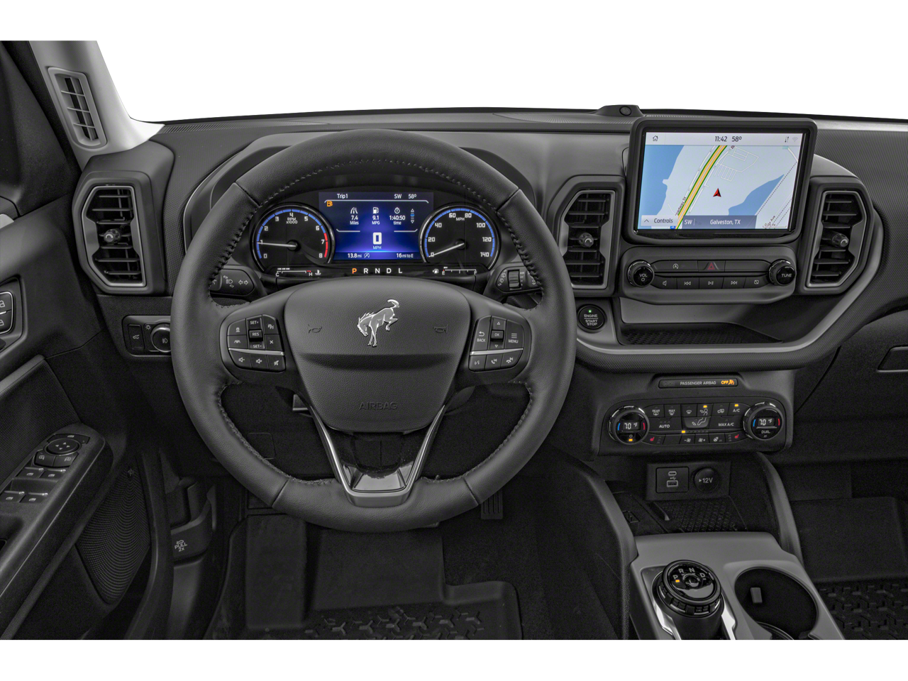 This Ford Bronco Sport is equipped with the following features: Equipment Group 300A, Ford Co-Pilot360 Assist+ (Evasive Steering Assist, Intelligent Adaptive Cruise Control w/Stop & Go, and Voice-Activated Touchscreen Navigation System), Tech Package (HD Radio, Universal Garage Door Opener (UGDO), and Wireless Charging Pad), 3.80 Axle Ratio, 4-Wheel Disc Brakes, 6 Speakers, ABS brakes, Air Conditioning, Alloy wheels, AM/FM radio: SiriusXM, AM/FM Stereo, Auto High-beam Headlights, Auto-dimming Rear-View mirror, Automatic temperature control, Brake assist, Cargo Management System, Cargo Mat, Compass, Delay-off headlights, Driver door bin, Driver vanity mirror, Dual front impact airbags, Dual front side impact airbags, Electronic Stability Control, Emergency communication system: SYNC 3 911 Assist, Four wheel independent suspension, Front & Rear Floor Liners w/o Carpet Mats, Front anti-roll bar, Front Bucket Seats, Front Center Armrest, Front dual zone A/C, Front fog lights, Front License Plate Bracket, Front reading lights, Fully automatic headlights, Heated door mirrors, Heated front seats, Heated steering wheel, Illuminated entry, Knee airbag, Low tire pressure warning, Memory seat, Occupant sensing airbag, Outside temperature display, Overhead airbag, Overhead console, Panic alarm, Passenger door bin, Passenger vanity mirror, Power door mirrors, Power driver seat, Power Moonroof, Power passenger seat, Power steering, Power windows, Premium-Trimmed Heated Sport Contour Bucket Seats, Radio data system, Rain sensing wipers, Rear anti-roll bar, Rear Parking Sensors, Rear reading lights, Rear seat center armrest, Rear window defroster, Rear window wiper, Remote keyless entry, Security system, SiriusXM, Speed control, Speed-sensing steering, Speed-Sensitive Wipers, Split folding rear seat, Steering wheel mounted audio controls, SYNC 3 Communications & Entertainment System, Tachometer, Telescoping steering wheel, Tilt steering wheel, Traction control, Trip computer, Variably intermittent wipers, and Wheels: 18 Ebony Black-Painted Aluminum. Recent Arrival! 25/29 City/Highway MPG